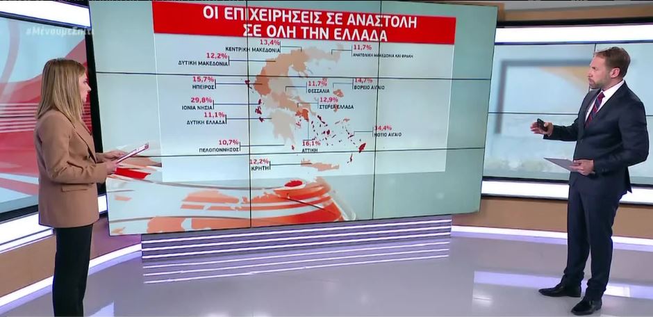 Με βάση τα στοιχεία αυτά, η Περιφέρεια με το μεγαλύτερο ποσοστό επιχειρήσεων σε αναστολή λειτουργίας είναι το Νότιο Αιγαίο (34,4%) και η Περιφέρεια με το αντίστοιχο μικρότερο ποσοστό είναι η Πελοπόννησος (10,7%).