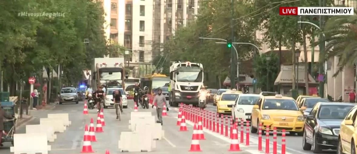 Ακόμα και αργά το απόγευμα της Δευτέρας (15/6), στην Πανεπιστημίου, υπήρχε κίνηση αφού πλέον χρησιμοποιούνται μόνο οι 3 αριστερές λωρίδες.