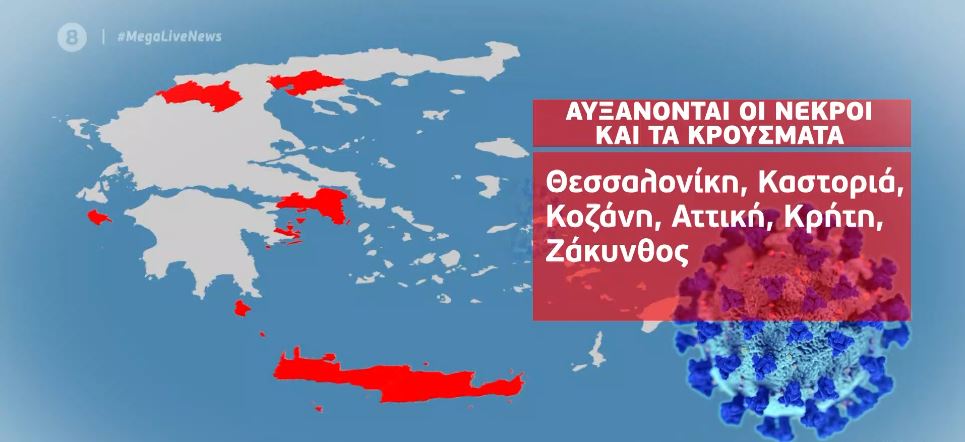 Το μεσημέρι οι νεκροί στη χώρα έφτασαν τους 252, με μια σειρά από περιοχές να βρίσκονται ξανά στο «κόκκινο». Η Θεσσαλονίκη βρίσκεται στο επίκεντρο, καθώς το γηροκομείο στο Ασβεστοχώρι γίνεται η μεγαλύτερη εστία θανάτου από την αρχή της πανδημίας.