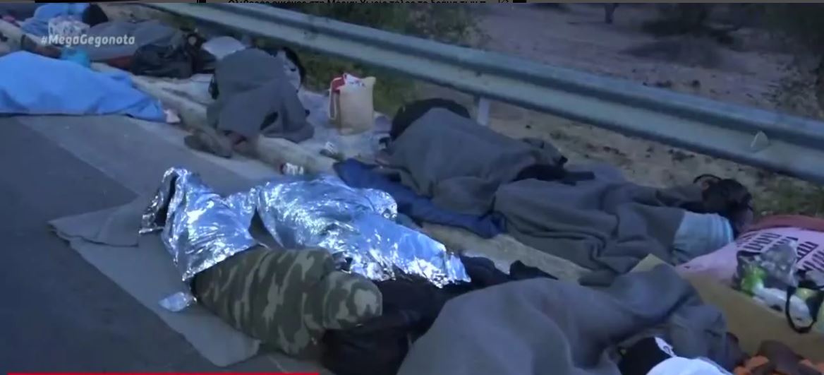 Είχε προηγηθεί μία δύσκολη νύχτα…. Μια νύχτα στην άσφαλτο… Η κάμερα του μεγκα διασχίζει τον επαρχιακό δρόμο που συνδέει τη Μόρια με την Παναγιούδα. Δεξιά και αριστερά του αφώτιστου δρόμου, για 5 τουλάχιστον χιλιόμετρα πρόσφυγες και μετανάστες κοιμούνται τυλιγμένοι με μία κουβέρτα που κατάφεραν να σώσουν από τον φλεγόμενο καταυλισμό. Αγκαλιά με τα παιδιά τους…