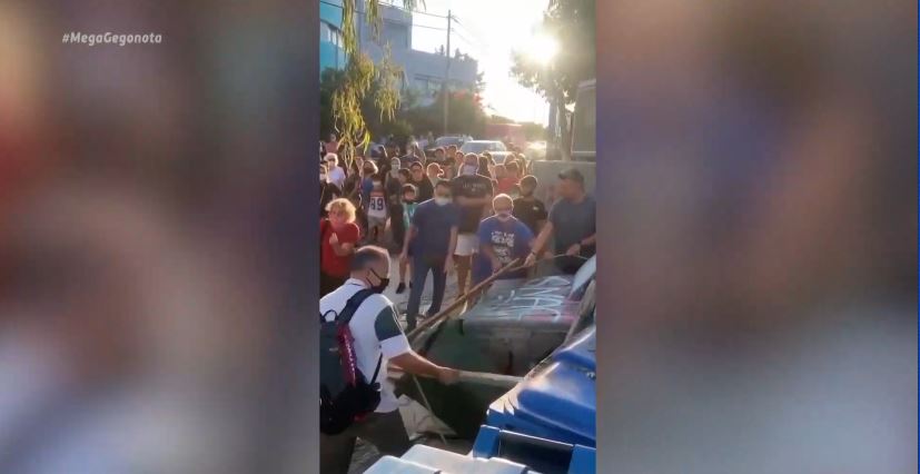 Κυκλωμένοι από μαθητές, οι γονείς σε έξαλλη κατάσταση προσπαθούν να απομακρύνουν από την κεντρική πόρτα κάδους απορριμμάτων και σίδερα που κρατούν κλειστό το σχολικό κτίριο.