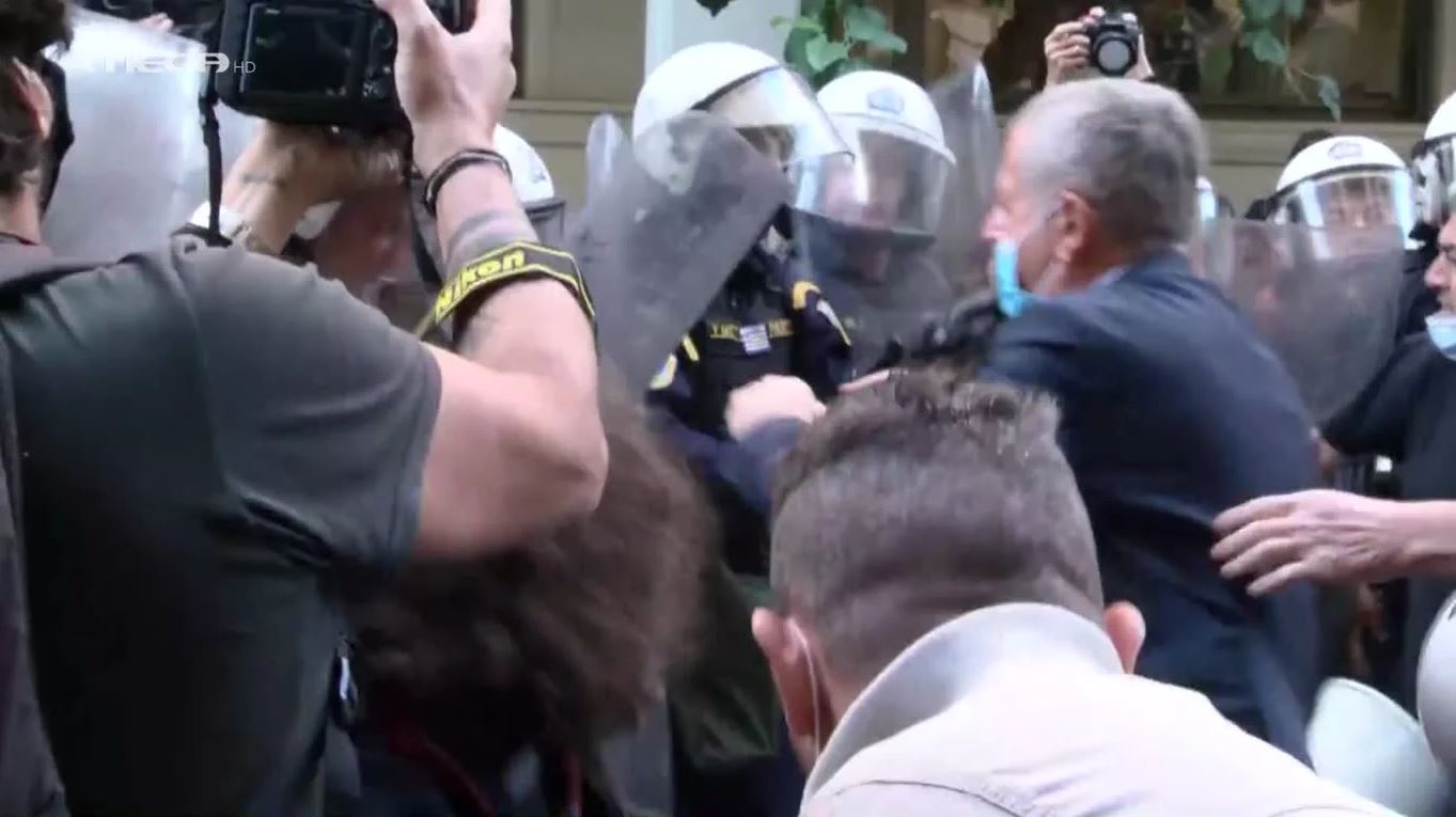 Ένταση επικράτησε νωρίτερα έξω από το υπουργείο Υγείας, όταν μέλη της ΠΟΕΔΗΝ προσπάθησαν να σπάσουν τον κλοιό των ΜΑΤ και να προσεγγίσουν το υπουργείο.