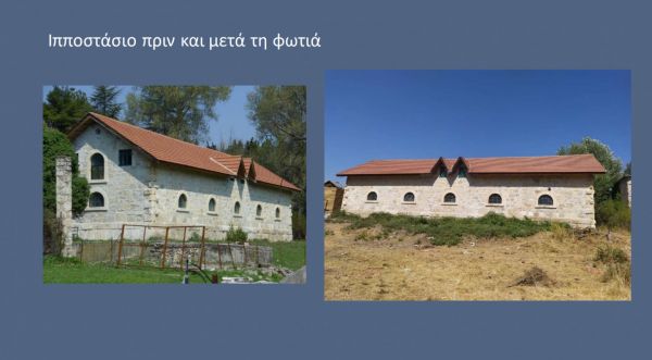 Κάηκαν στέγες, κάποιες εξ αυτών ήταν νεότερες επεμβάσεις, του Υπουργείου Πολιτισμού, σωστικές δηλαδή επεμβάσεις οι οποίες έγιναν τα προηγούμενα χρόνια. Άλλες στέγες ήταν ήδη μισογκρεμισμένες, οπότε κάηκαν ξύλινα στοιχεία και ξύλινα κουφώματα, τα οποία σε πάρα πολλές περιπτώσεις ήταν και αυτά μέσα στις σωστικές παρεμβάσεις και είχαν αποκατασταθεί από το Υπουργείο Πολιτισμού τα προηγούμενα χρόνια ή ήταν απλώς ψευδοκουφώματα για να κλείσουν τα κενά των παλαιών κουφωμάτων.
