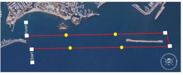 Οι εκκινήσεις θα δίνονται ανά 2 πληρώματα και θα υπάρχει ξεχωριστή χρονομέτρηση για το κάθε πλήρωμα. Το κάθε πλήρωμα θα πρέπει διανύσει 2 φορές την διαδρομή που εμφανίζει ο παρακάτω χάρτης, πραγματοποιώντας τις αντίστοιχες στροφές στις σημαδούρες. Αν ένα πλήρωμα δεν περάσει επιτυχώς όλες τις σημαδούρες, ακυρώνεται. Θα πραγματοποιηθεί τεχνική ενημέρωση λίγο πριν την έναρξη του αγώνα σε όλα τα πληρώματα.