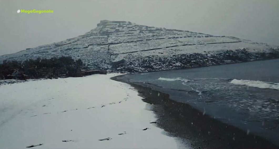 Στα λευκά ντύθηκε και το «νησί των ανέμων», με τις παραλίες της να έχουν καλυφθεί εξ ολοκλήρου από χιόνι.