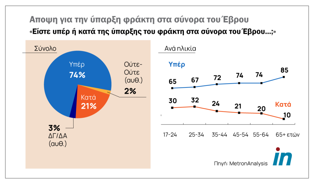 Αναφορικά με τον φράχτη στον Έβρο, το συντριπτικό 74% τάσσεται υπέρ, το 21% κατά και το 2% ούτε το ένα ούτε το άλλο. Εδώ φαίνεται γιατί η ΝΔ έπαιξε δυνατά το χαρτί του φράχτη ενώ ο ΣΥΡΙΖΑ με τις αντιφατικές δηλώσεις του έχασε έδαφος.