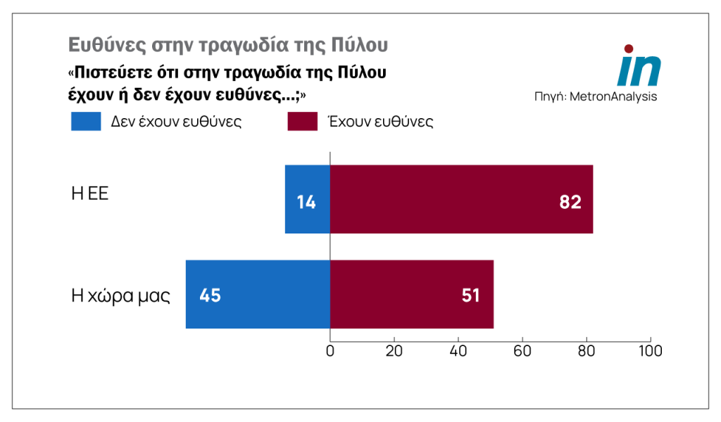 Μάλιστα, 82% πιστεύει ότι η ΕΕ έχει ευθύνες για το ναυάγιο και το 51% ότι έχει και η χώρα μας ενώ 45% λέει ότι δεν έχει.