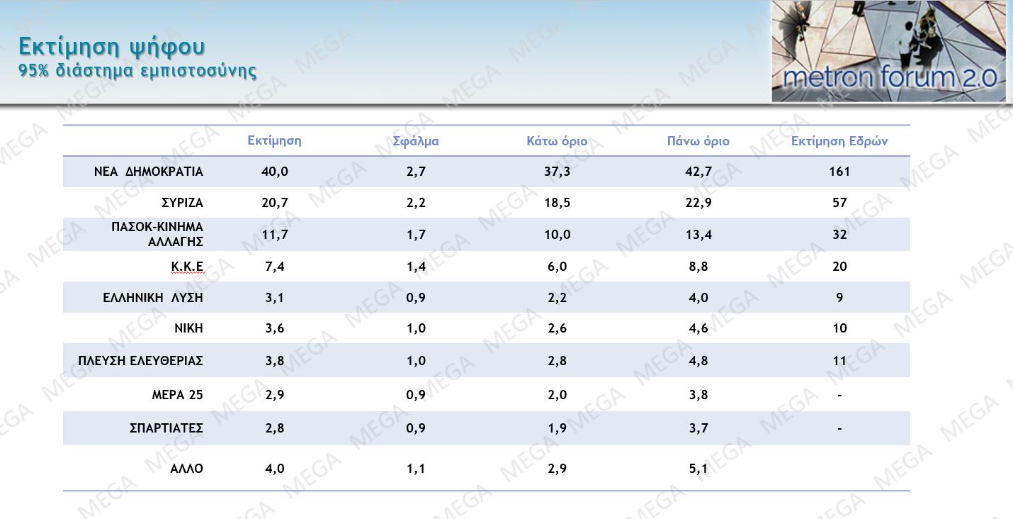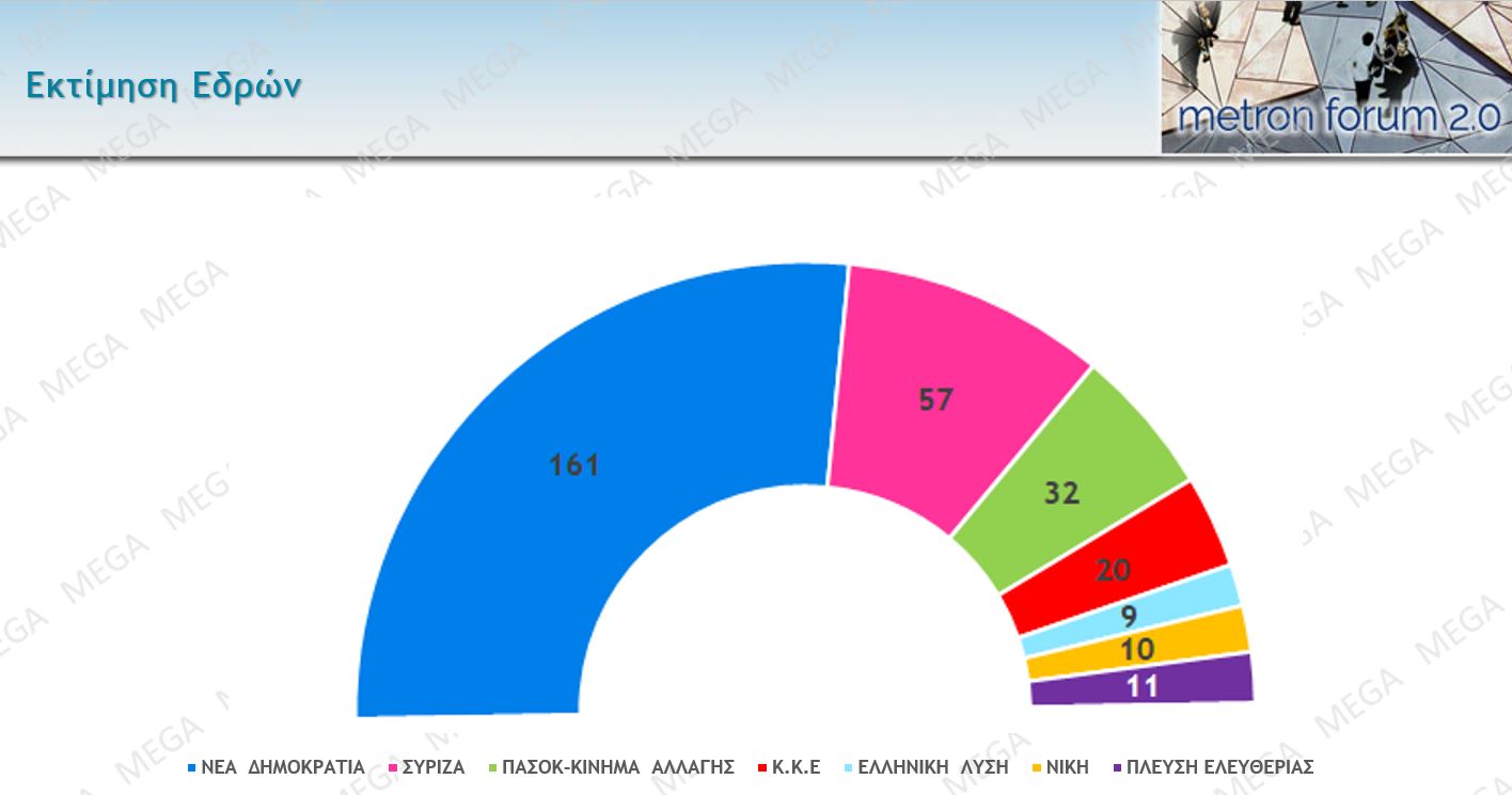 Η ΝΔ μπορεί να κινηθεί από 37,3% έως 42,7% και να πάρει 161 έδρες στο καλό σενάριο.