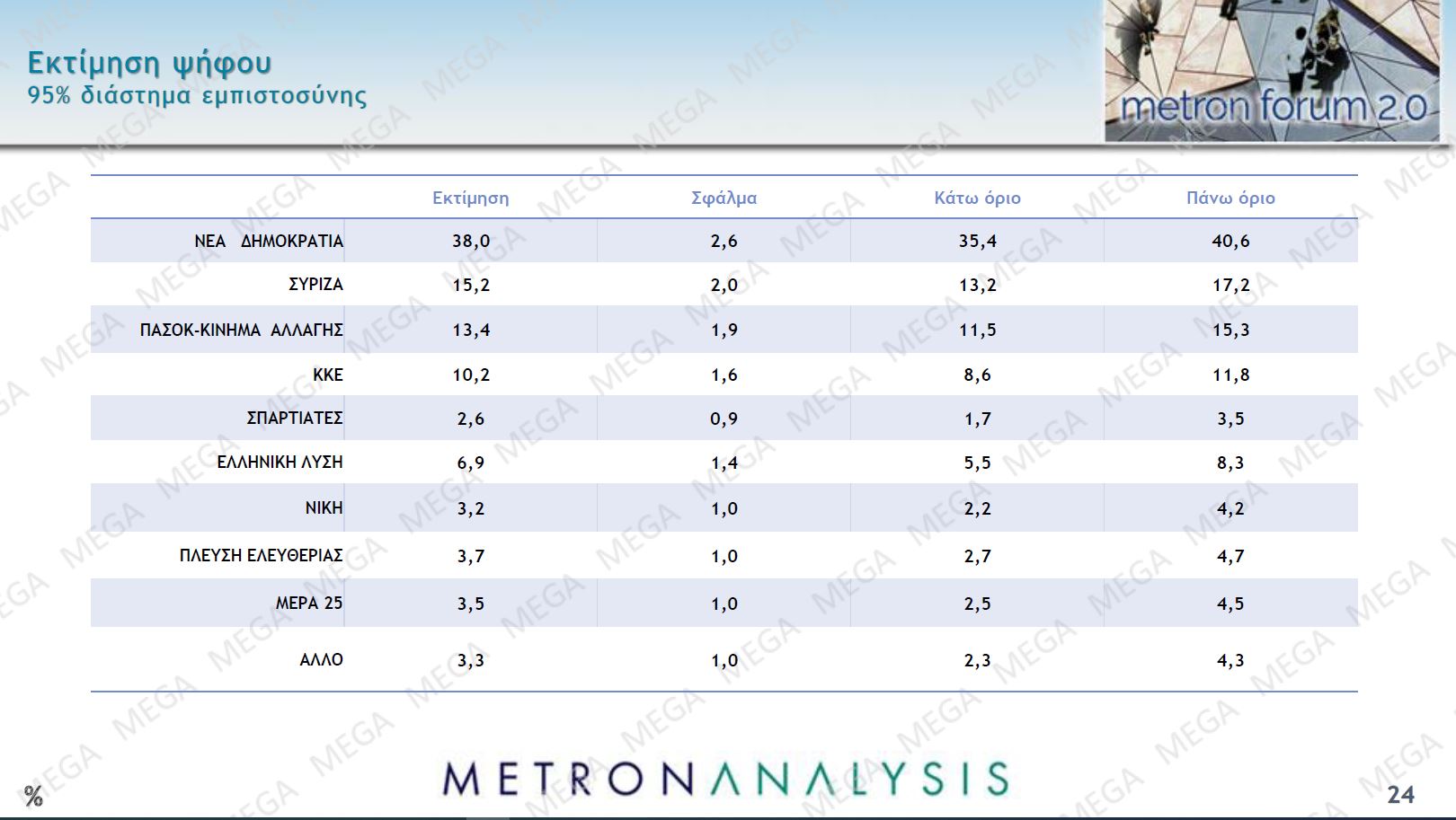 Η μεγάλη δημοσκόπηση της Metron Analysis για το MEGA δείχνει πως η Νέα Δημοκρατία προηγείται του ΣΥΡΙΖΑ με 18 μονάδες στην πρόθεση ψήφου ενώ οι πολίτες αξιολογούν τον Στέφανο Κασσελάκη.