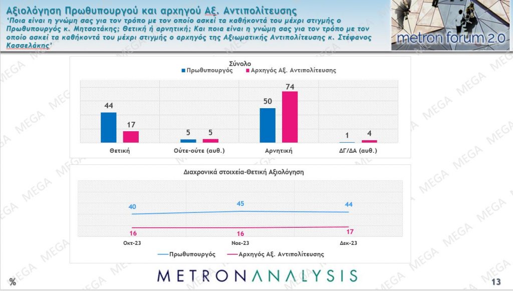 Η κυβέρνηση έχει 56% αρνητικές γνώμες και 38% θετικές, την ώρα που ο ΣΥΡΙΖΑ έχει 83% αρνητικές γνώμες ως αξιωματική αντιπολίτευση και μόλις 10% θετικές (με μικρή άνοδο με το ακόμη χειρότερο 8% του Νοεμμβρίου).