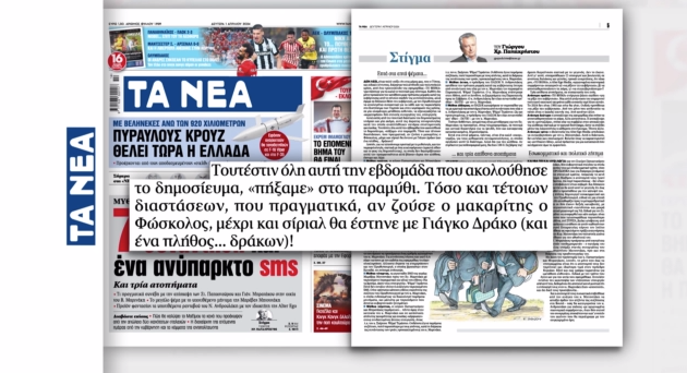 «Τουτέστιν, όλη αυτή την εβδομάδα που ακολούθησε το δημοσίευμα, «πήξαμε» το παραμύθι. Τόσο και τέτοιων διαστάσεων, που πραγματικά, αν ζούσε ο μακαρίτης ο Φώσκολος, μέχρι και σίριαλ θα έστηνε με Γιάγκο Δράκο (και ένα πλήθος… δράκων)!».