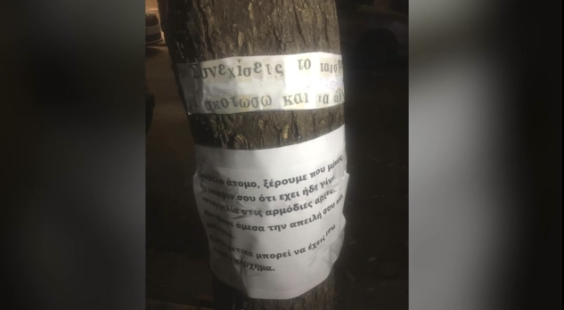 Τις αποκρουστικές εικόνες με τις νεκρές και αποκεφαλισμένες γάτες στον λόφο της Κυψέλης, πλαισιώνει το αρρωστημένο μήνυμα, πάνω σε έναν κορμό δέντρου.