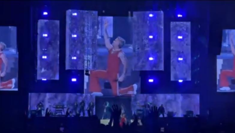 Φορώντας κόκκινα ρούχα, ο Ρόμπι Γουίλιαμς εμφανίστηκε μπροστά στο κοινό και έκανε την ατμόσφαιρα να πάρει «φωτιά», ερμηνεύοντας τις μεγάλες επιτυχίες του.