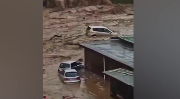 Χείμαρροι λάσπης παρασύρουν αυτοκίνητα σε έναν από τους κεντρικούς δρόμους στο Ελένιτε, στην ανατολική Βουλγαρία.