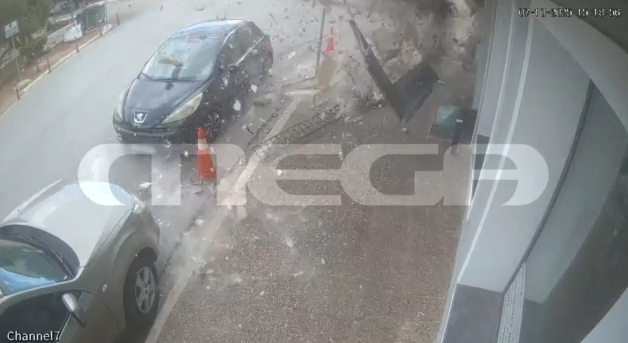Οι τόνοι τσιμέντου καταστρέφουν ολοσχερώς τέσσερα από τα σταθμευμένα οχήματα, μπροστά από το φαρμακείο.
