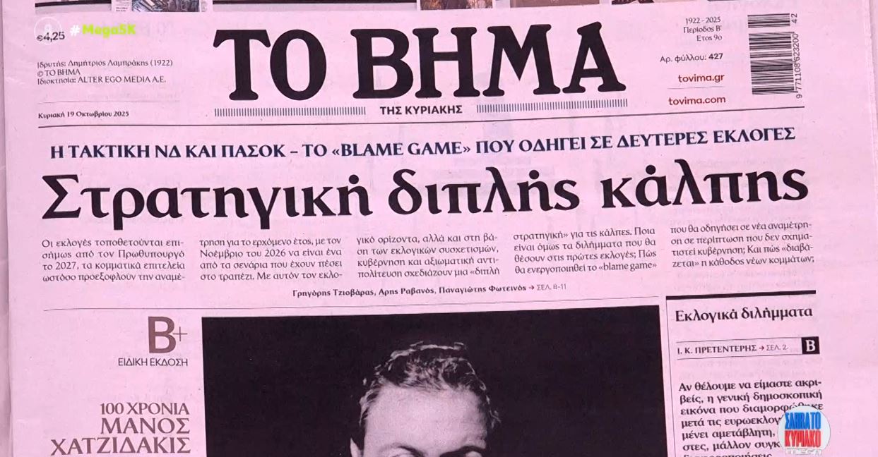 Ελλάδα 19.10.2025 • 07:02 Τα πρωτοσέλιδα των εφημερίδων σήμερα Τι γράφουν οι εφημερίδες σήμερα 19/10/2025. Σχετικά Tags: MEGAMEGA ENHMEΡΩΣΗΕΦΗΜΕΡΙΔΕΣΜEGA ΣΑΒΒΑΤΟΚΥΡΙΑΚΟΠΡΩΤΟΣΕΛΙΔΑΠΡΩΤΟΣΕΛΙΔΑ ΕΦΗΜΕΡΙΔΩΝ