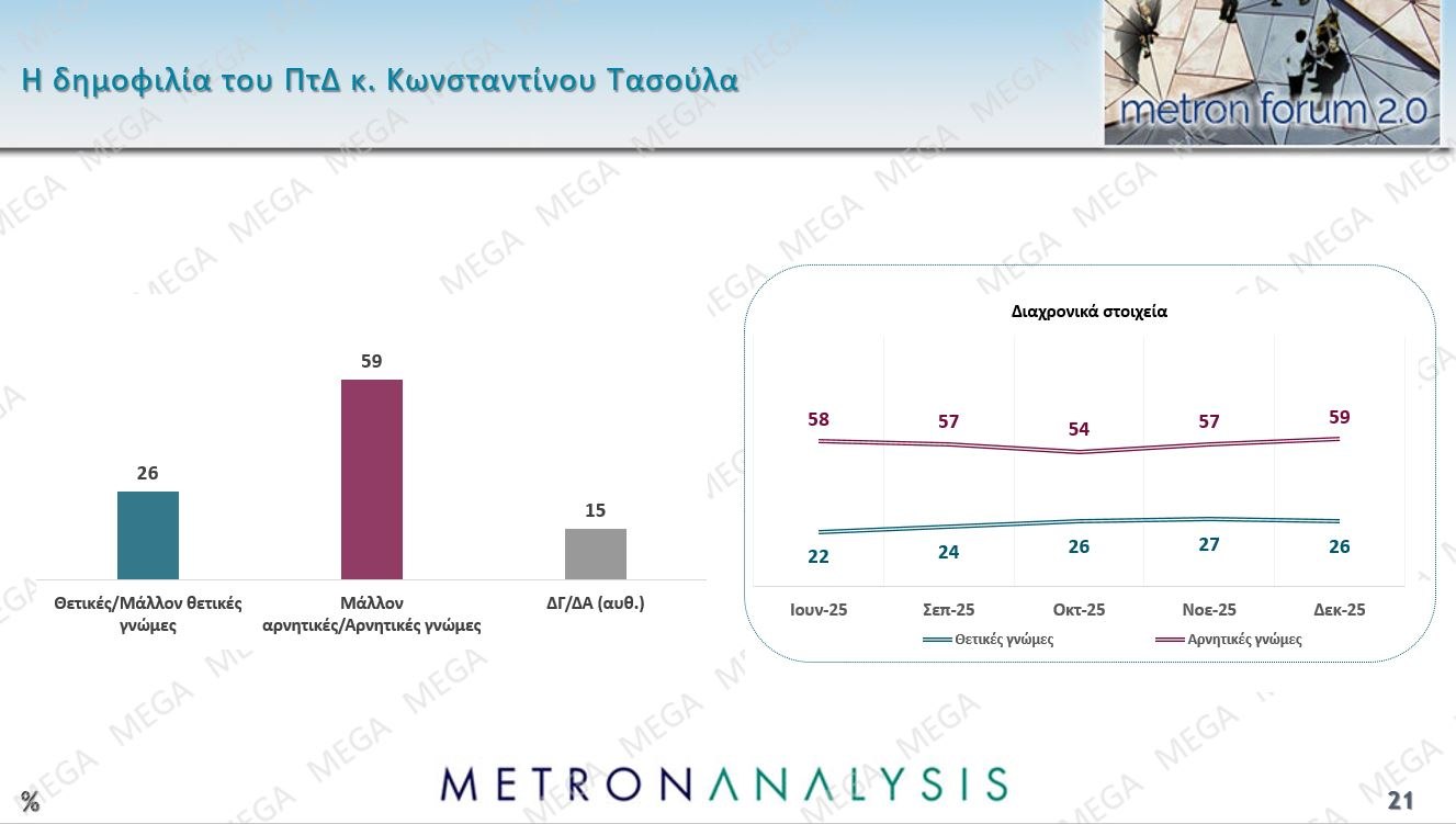 Ο Πρόεδρος της Δημοκρατίας, κ. Κωνσταντίνος Τασούλας εξακολουθεί να έχει κατά πλειοψηφία αρνητικές γνώμες σύμφωνα με τη δημοσκόπηση (59% αρνητικές γνώμες και 26% θετικές) μην έχοντας καταφέρει ακόμη να «σπάσει» την εικόνα του «κομματικού Προέδρου».