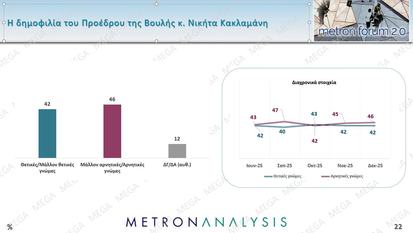 Αντίθετα, ο Πρόεδρος της Βουλής Νικήτας Κακλαμάνης έχει ένα θετικότερο ισοζύγιο, με τις θετικές γνώμες στο 42%, άρα πάνω από την επιρροή της ΝΔ, και τις αρνητικές στο 46%