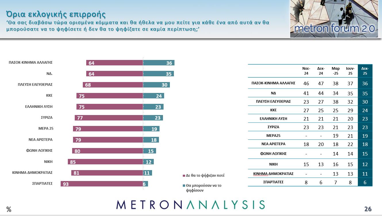 Η Νέα Δημοκρατία έχει απώλειες προς την Ελληνική Λύση, τη Φωνή Λογικής και το ΠΑΣΟΚ, ενώ η συσπείρωση βρίσκεται στο 59,8%. Ο ΣΥΡΙΖΑ έχει συσπείρωση στο 19,2% και απώλειες προς την Πλεύση Ελευθερίας, τη Νεά Αριστερά, το ΠΑΣΟΚ. Το ΠΑΣΟΚ έχει την υψηλότερη συσπείρωση στο 66.9% με απώλειες προς Πλεύση Ελευθερίας και την Ελληνική Λύση.