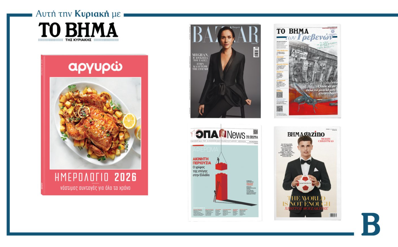 Αύριο το ΒΗΜΑ κυκλοφορεί με το εορταστικό τεύχος του περιοδικού HARPER’S BAZAAR GREECE, το «Ημερολόγιο συνταγών» για το 2026 της Αργυρώς Μπαρμπαρίγου, την Μαθητική Εφημερίδα «ΤΟ ΒΗΜΑ των Γρεβενών», την εφημερίδα του Οικονομικού Πανεπιστημίου και το BHMAGAZINO με εξώφυλλο τον νεαρό ταλαντούχο παίκτη του Ολυμπιακού, Χρήστο Μουζακίτη.