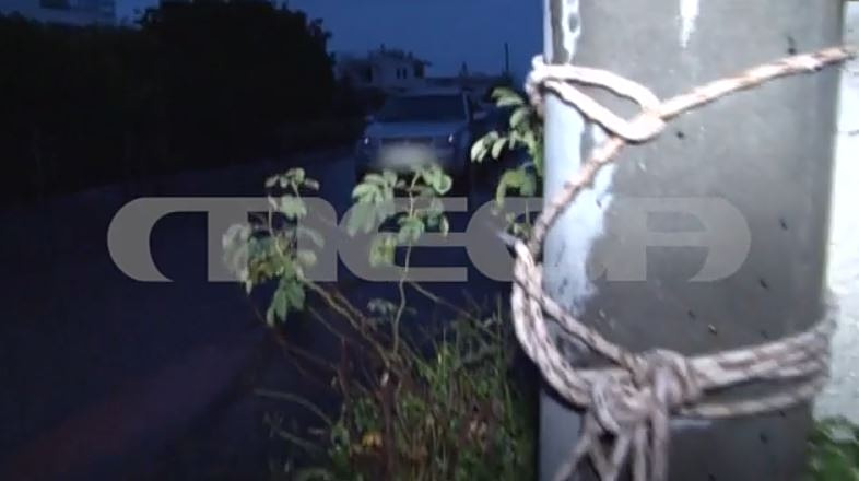 Ένα αυτοκίνητο το οποίο ο ιδιοκτήτης του το έχει δέσει με σχοινί από μια κολώνα ρεύματος προκειμένου να μην το πάρει το ρέμα.