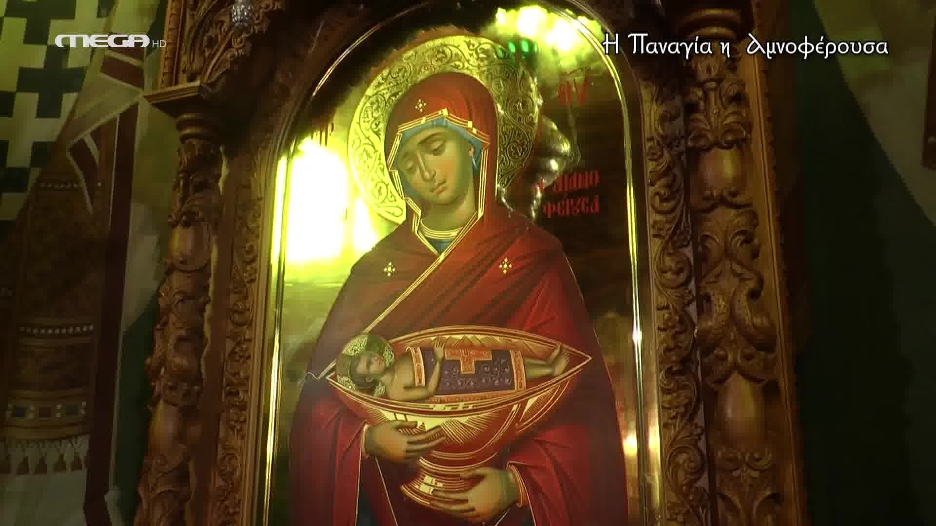 Ο Θεμιστοκλής Χριστοδούλου, Προϊστάμενος του Ιερού Ναού Αγίου Ελευθερίου Αχαρνών, μιλά για την σπάνια εικόνα της Παναγίας Αμνοφέρουσας που βρίσκεται στον θρόνο του Επισκόπου στον ναό και δείχνει τη Θεοτόκο να κρατά τον Χριστό μέσα σε δισκάριο, έτοιμο να σφαγιαστεί για τη σωτηρία των ανθρώπων.